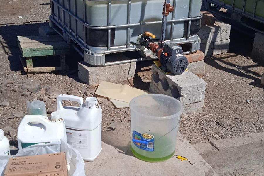 Como parte del proceso de validación del proyecto, se realizó un escalamiento progresivo del cultivo, iniciando con 20 litros de cepa activa de Chlorella. Posteriormente, el sistema fue llevado a condiciones de campo, alcanzando un volumen total de 2 000 litros, distribuidos en dos recipientes cuadrados o cúbicos de 1 000 litros cada uno